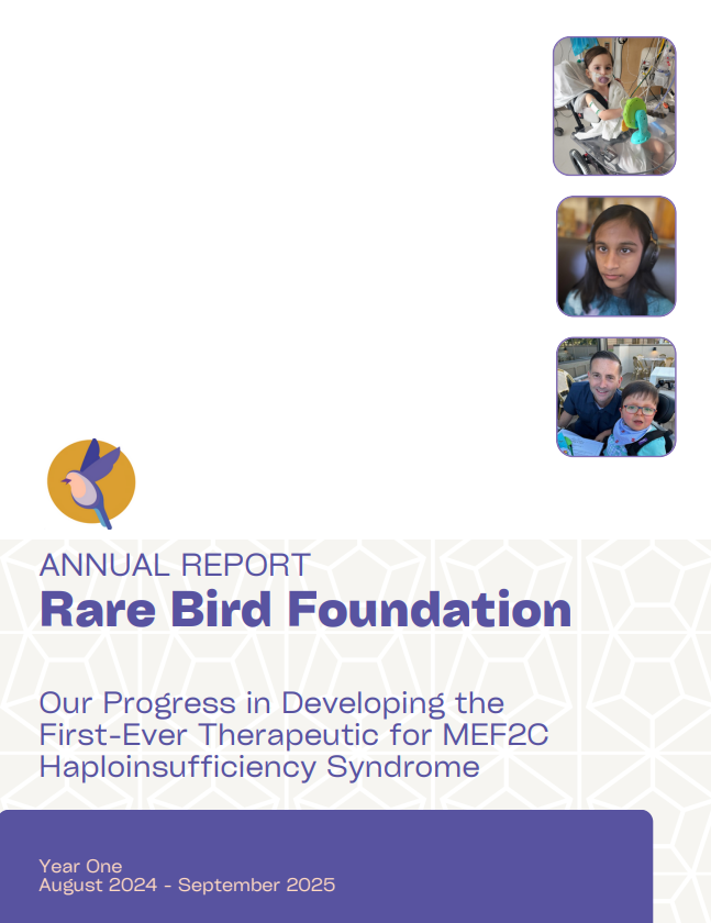 Over the past year, with the help of our partners and supporters like you, the Rare Bird Foundation has moved mountains for children with MCHS. We’ve shown that our therapeutics can increase the level of MEF2C expression in mouse and human cells, and our clinical readiness study—the Volare Study—has already begun its second round of patient visits. We’ve also organized our community's first formal engagement with the FDA, continued characterizing three distinct MCHS mouse models to understand the nuances of various MEF2C mutations, and in the next couple months we will deliver our community's first iPSC lines and toxicology tests to optimize our treatments.